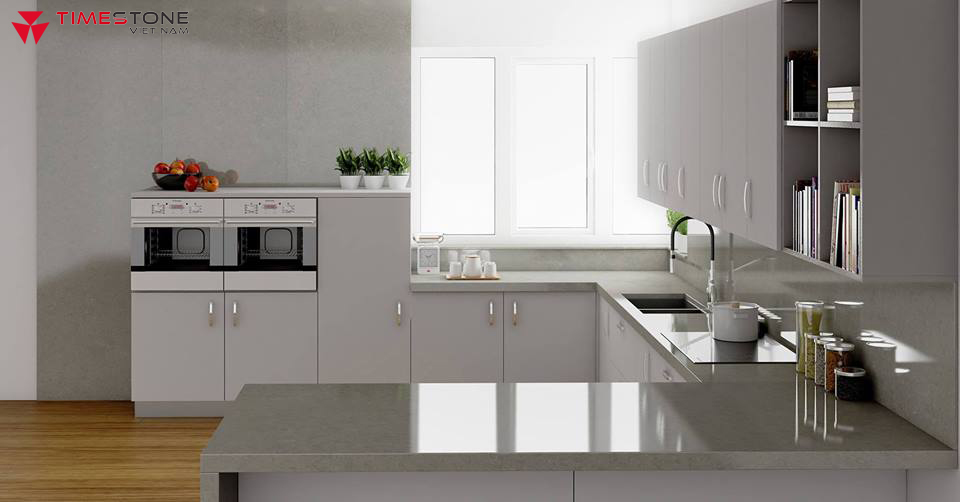 Nếu bạn cũng muốn sở hữu một căn bếp hiện đại như thế thì hãy thử tham khảo các thiết kế bàn bếp, bàn đảo, bàn ăn từ đá nhân tạo gốc thạch anh. Đây là loại vật liệu có khả năng chống ố, chống thấm, chống bám bẩn và kháng khuẩn cực tốt, dễ dàng vệ sinh và có tuổi thọ lên tới hàng chục năm, rất thích hợp dùng trong phòng bếp.
