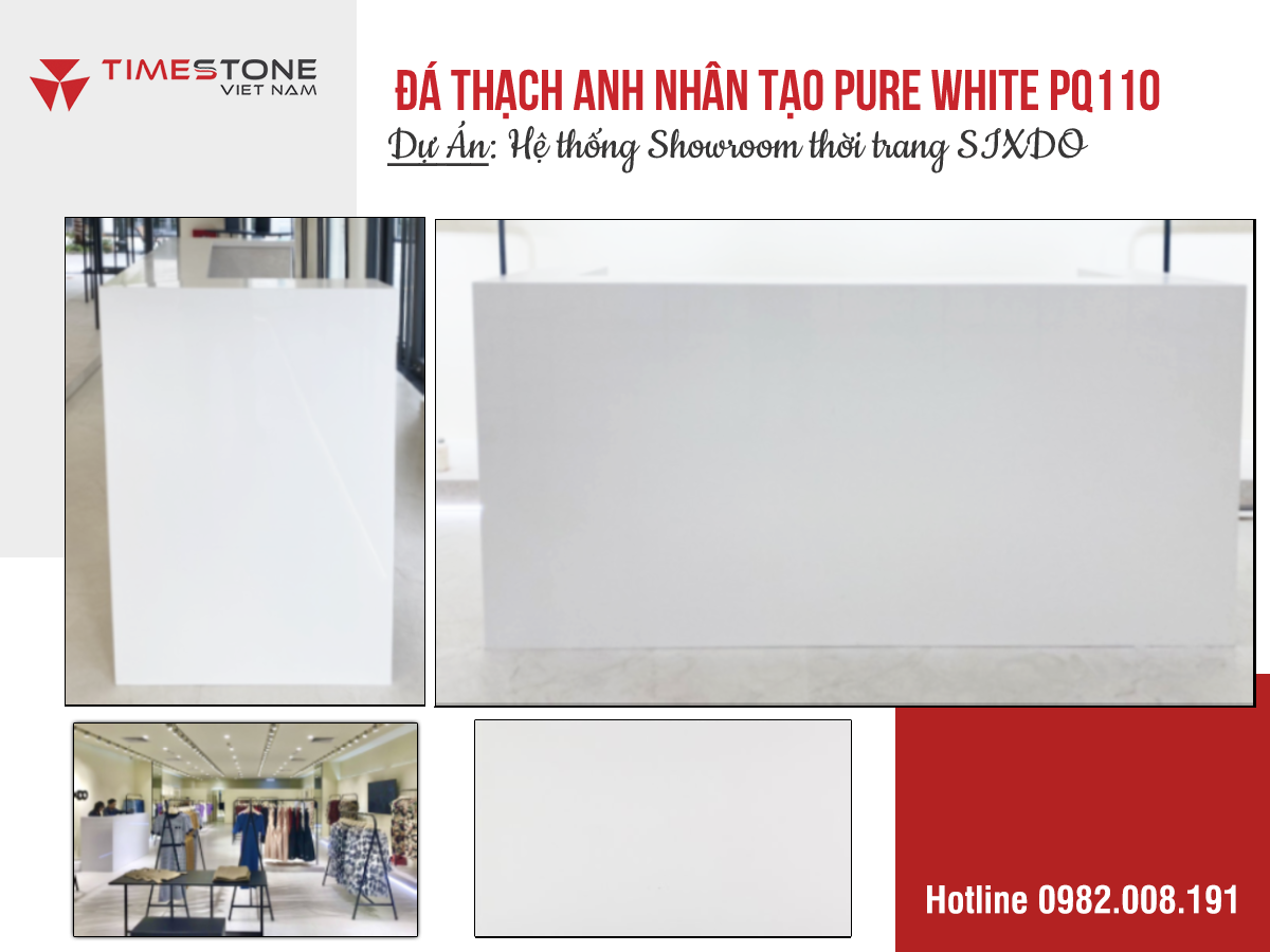 Đá thạch anh Pure White PQ110 đã được lựa chọn sử dụng cho quầy lễ tân, nơi điểm nhấn và dẫn dắt cho toàn bộ cửa hàng. Với màu trắng siêu mềm và siêu tinh khiết cho sự đơn giản sang trọng. Đặc biệt, với tone màu trắng sáng sang trọng làm cho không gian cửa hàng trở nên sự huyền bí, nhưng vẫn mang đậm nét cá tính trẻ trung, tinh tế. Mẫu mầu Pure white dễ dàng làm tôn lên các nội thất cũng như Iterm trong showroom.